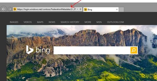 Sustituyo <TenantDomainName> por contoso.onmicrosoft.com https://login.windows.net/contoso.onmicrosoft.com/FederationMetadata/2007-06/FederationMetadata.xml