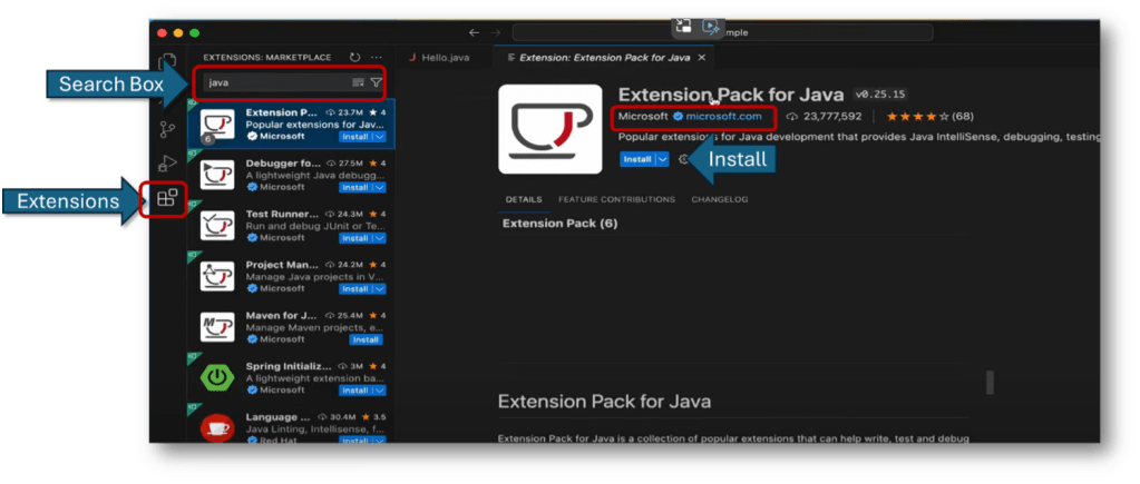 In the “Extensions” menu in VSCode, search for “Extension Pack for Java” from Microsoft, now click on install.