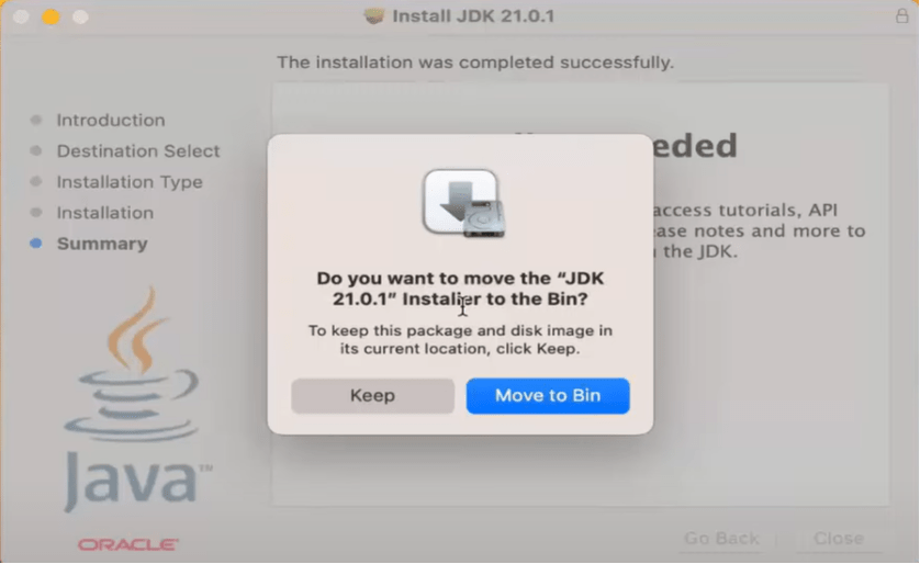 MacOS is going to ask you if you want to move the installer file to the Bin, click on ”Move to Bin”