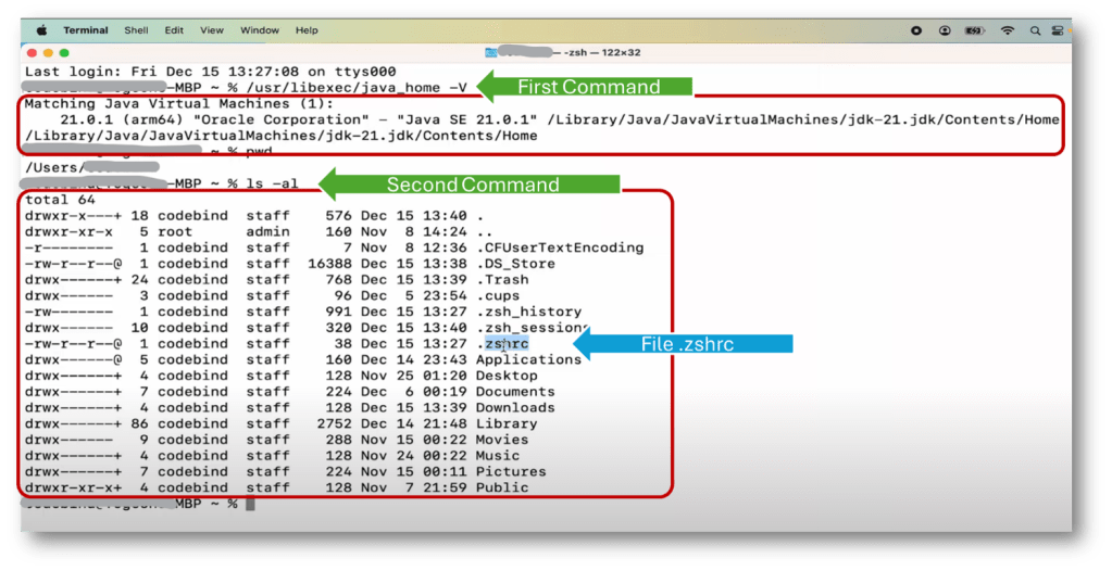 - Validate if you have the file “.zshrc”. We will use the command “ls -al” to display all the files in the current directory.